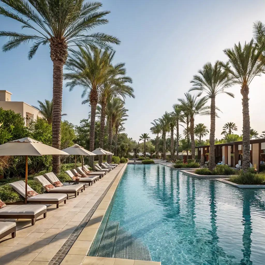 A photograph showcasing the heated outdoor swimming pool at Palmstone Farmhouse, with clear blue water and comfortable lounge chairs around the pool deck, under a sunny sky.